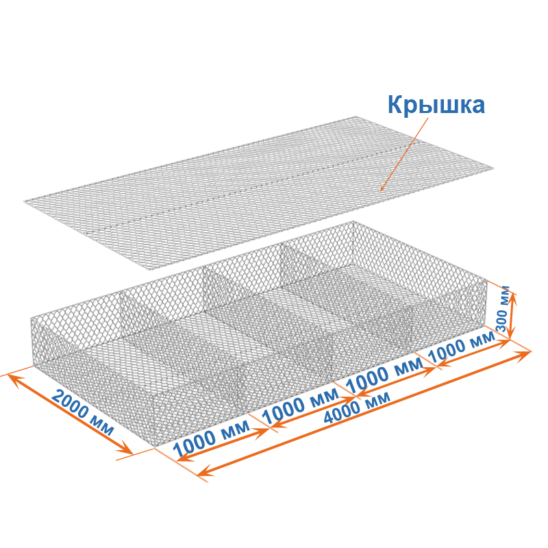 Матрасы Рено 4x2x0,3 — плоские габионные секции из сетки двойного кручения с ячейкой 80х100, проволокой 2,7 мм и покрытием Цинк.